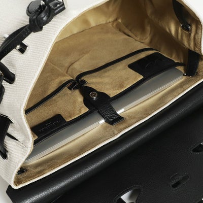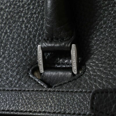 コンパートメントされたポケットやペン差しなど、スッキリスマートに収納できる内装。ポケットにはウレタンが入っているのでスマホなどを入れるのにも便利です。ボトムは底びょう付きで置いて使うのも安心。正面のベルトを止めている金具は上が空いていて、外しやすくなっています。崩して持つのもまた乙です。
