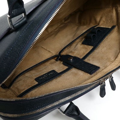 コンパートメントされたポケットやペン差しなど、スッキリスマートに収納できる内装。ポケットにはウレタンが入っているのでスマホなどを入れるのにも便利です。ボトムは底びょう付きで置いて使うのも安心。メイン収納部分は中にジップ付のポケットがあり、2つに分かれているため、書類やPCなど荷物が多いビジネスマンにとって使い勝手は抜群です。背面にはスーツケースの持ち手を差し込んで装着できるスリーブもついています。