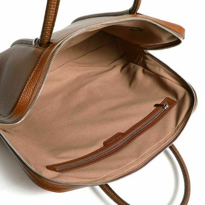 本体にはハイブランドにも提供し、定評のあるイタリアのオーヴァーロード社製レザーを使用。型押し後のミーリング加工により、革全体に柔らかさと膨らみを出しています。また細やかなシュリンク風に仕上げることで繊細で優しい佇まいの雰囲気に。さらにセミアニリン仕上げをすることで、色の均等性を保ちしっとりとした手触りの良さを実現しております。ハンドル部分にはメッシュの型押しレザーを使用。イタリアから輸入した薬剤を使用しクローム鞣しによりしなやかで自然な風合いに。使い込むことにより手に馴染んでいく経年変化を楽しめる仕様です。国内唯一LWG加盟タンナーによって生産されております。
