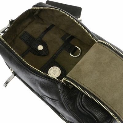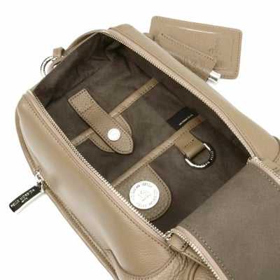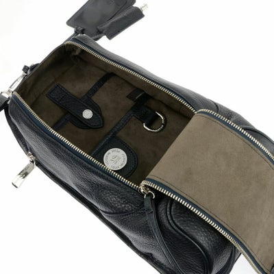 縦に引くファスナーは開け閉めがクセになるほど滑りの良いものを使用。大きく開くので中の物が見やすく、さらに小さなポケットがついているので、整理整頓もばっちりです。ある程度のやわらかさもあり、ボディ部分は体にフィットするデザイン。さらにベルトも着脱可能。自転車など両手をあけてスポーティーに行動したいときに活躍します。