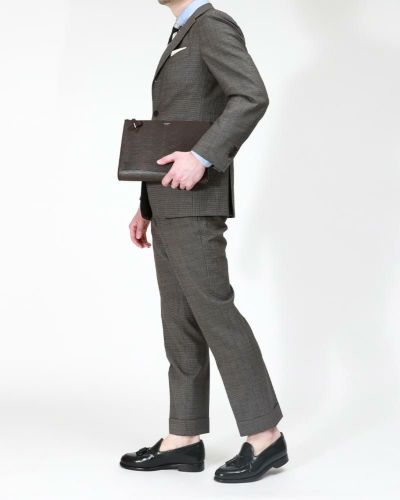 オフスタイルはもちろん、パーティーシーンでもクラッチバッグが活躍。このクラッチバッグはオリジナル型押しの革を贅沢に使用し、大人の男らしい仕上がりにしました。正面にはペッレモルビダらしい曲線的なハンドルが付属し、手を通しても持ちやすく、機能性もしっかり。引き手を止める金具&ベルト使いがデザインのワンポイントになっています。
