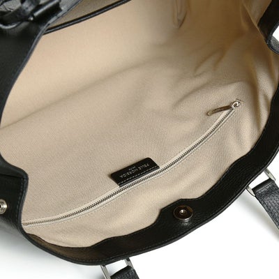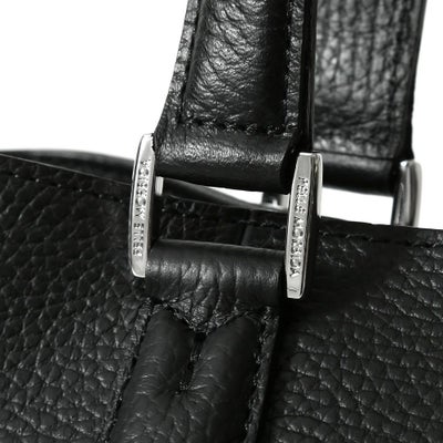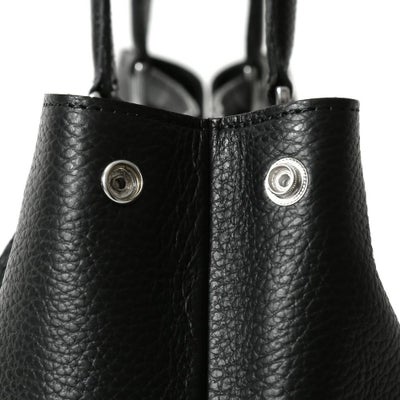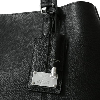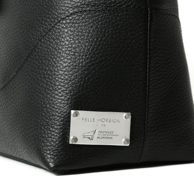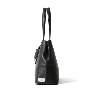 撥水シュリンクレザーをメインに、ネームタグとボトム部分に再生アルミプレートを使用したトートバッグ。