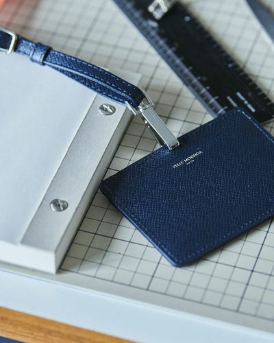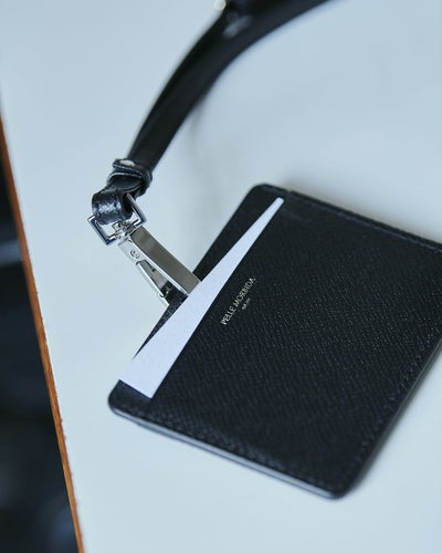 IDカードや身分証、その他のカードなど、常に身につける必要があるカード類を収納し、首からぶら下げられるIDケース。曲線的なフォルムと小さく施された箔押しが胸元をスタイリッシュに格上げします。ストラップの長さも調整できるので、男性はもちろん女性でもお使いいただけます。本格レザーとホワイト加工をした金具を使用しているので、長く使えるのも嬉しいポイントです。