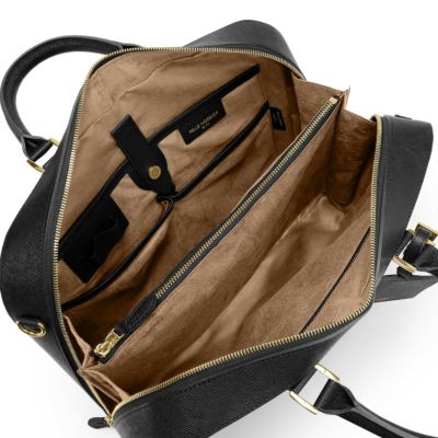 コンパートメントされたポケットやペン差しなど、スマートに収納できる内装。ポケットにはウレタンが入っているのでスマホなどを入れるのにも便利です。ボトムは底びょう付きで置いて使うのも安心。メイン収納部分は中にジップ付のポケットがあり、2つに分かれているため、書類やPCなど荷物が多いビジネスマンにとって使い勝手は抜群です。デザインのワンポイントとして下がったカード入れがより使いやすくなりました。