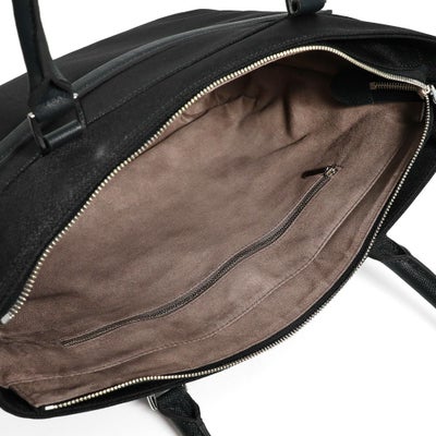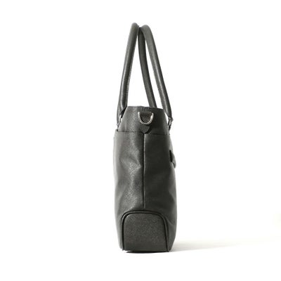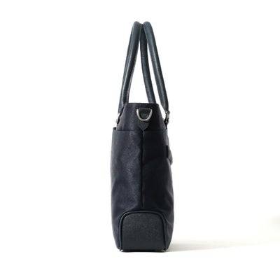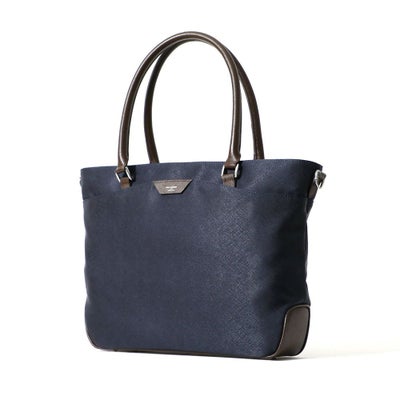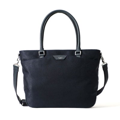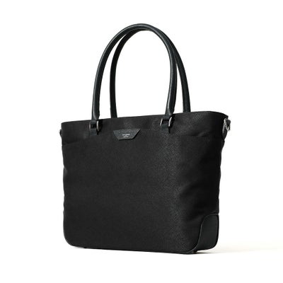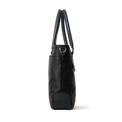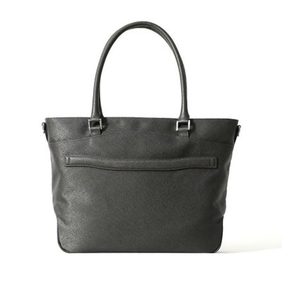 ビジネス用のトートバッグは前胴に深めのポケットがあり、A4サイズのクリアファイル程度は収納できる大きさ。スマートな見た目でスーツスタイルからジャケパンスタイルまで汎用性の高いデザインです。またキャリースルー付きなので出張や旅行にも重宝します。