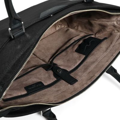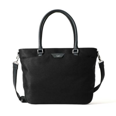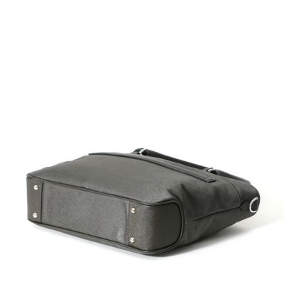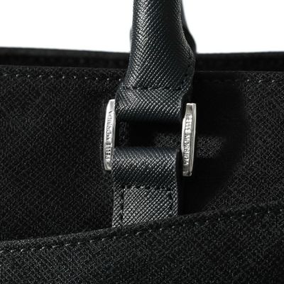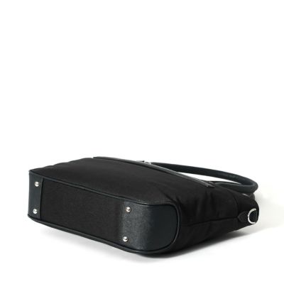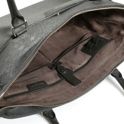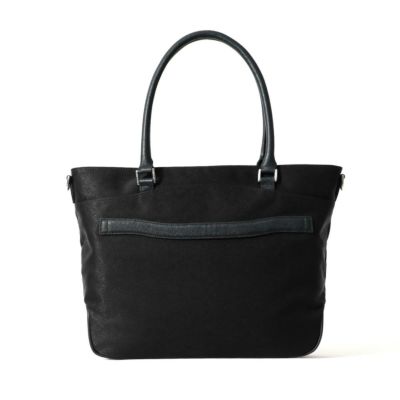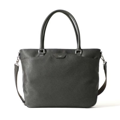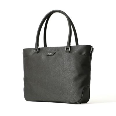 ビジネス用のトートバッグは前胴に深めのポケットがあり、A4サイズのクリアファイル程度は収納できる大きさ。スマートな見た目でスーツスタイルからジャケパンスタイルまで汎用性の高いデザインです。またキャリースルー付きなので出張や旅行にも重宝します。