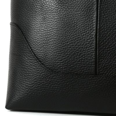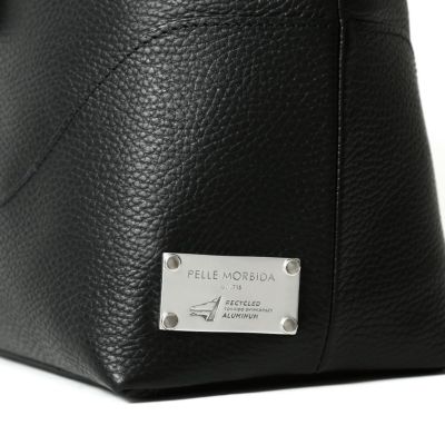 撥水シュリンクレザーをメインに、ネームタグとボトム部分に再生アルミプレートを使用したトートバッグ。