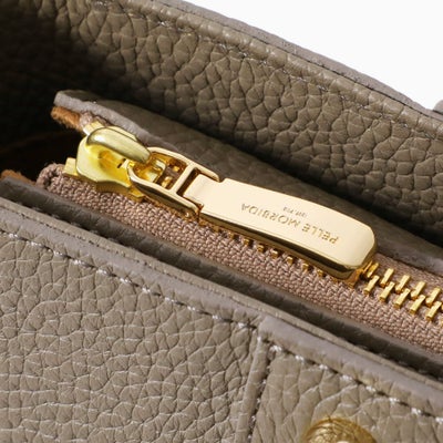 皮革生産地である姫路松原地区の牛革に、細やかなシボ型を押した上質なシュリンク風レザー。マットな質感をベースに、ほどよい光沢感を持たせ女性らしい色気を醸し出し、飽きのこない仕上がりに仕上げました。内装はマイクロライトスエードで心地よい肌触りに。ゴールドの輝く金具がアクセントになっています。