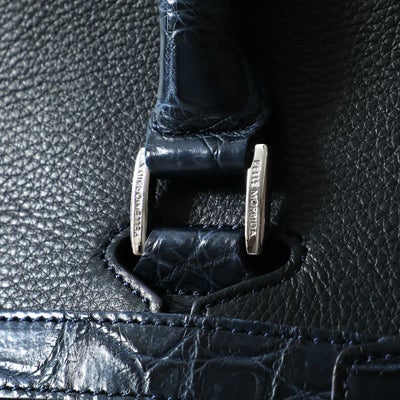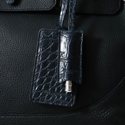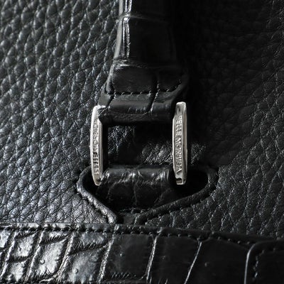部分使いしたクロコダイルレザーがさりげなく上質な雰囲気に仕上がりました。定番のフラップボストンバッグをベースにハンドル、ベルト、ネームタグ・ホイッスルをクロコダイルレザーに変更。