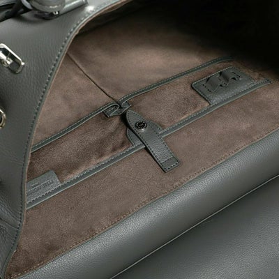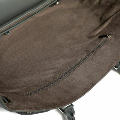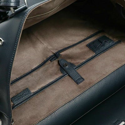 コンパートメントされたポケットやペン差しなど、スッキリスマートに収納できる内装。ポケットにはウレタンが入っているのでスマホなどを入れるのにも便利です。ボトムは底びょう付きで置いて使うのも安心。正面のベルトを止めている金具は上が空いていて、外しやすくなっています。崩して持つのもまた乙です。