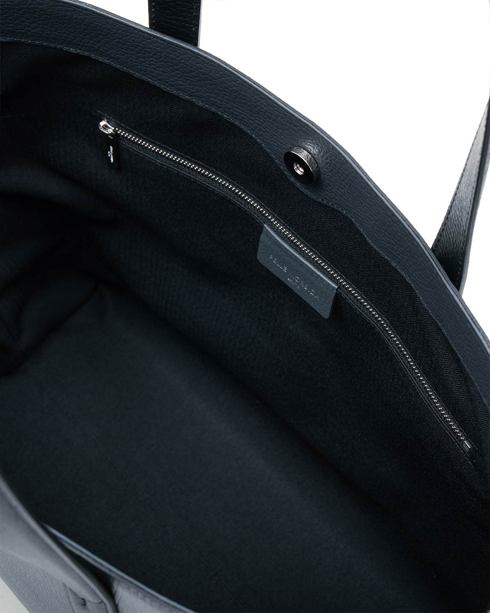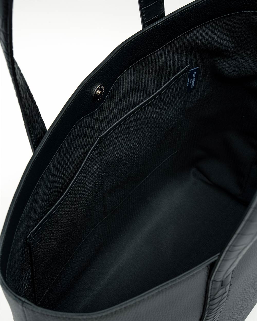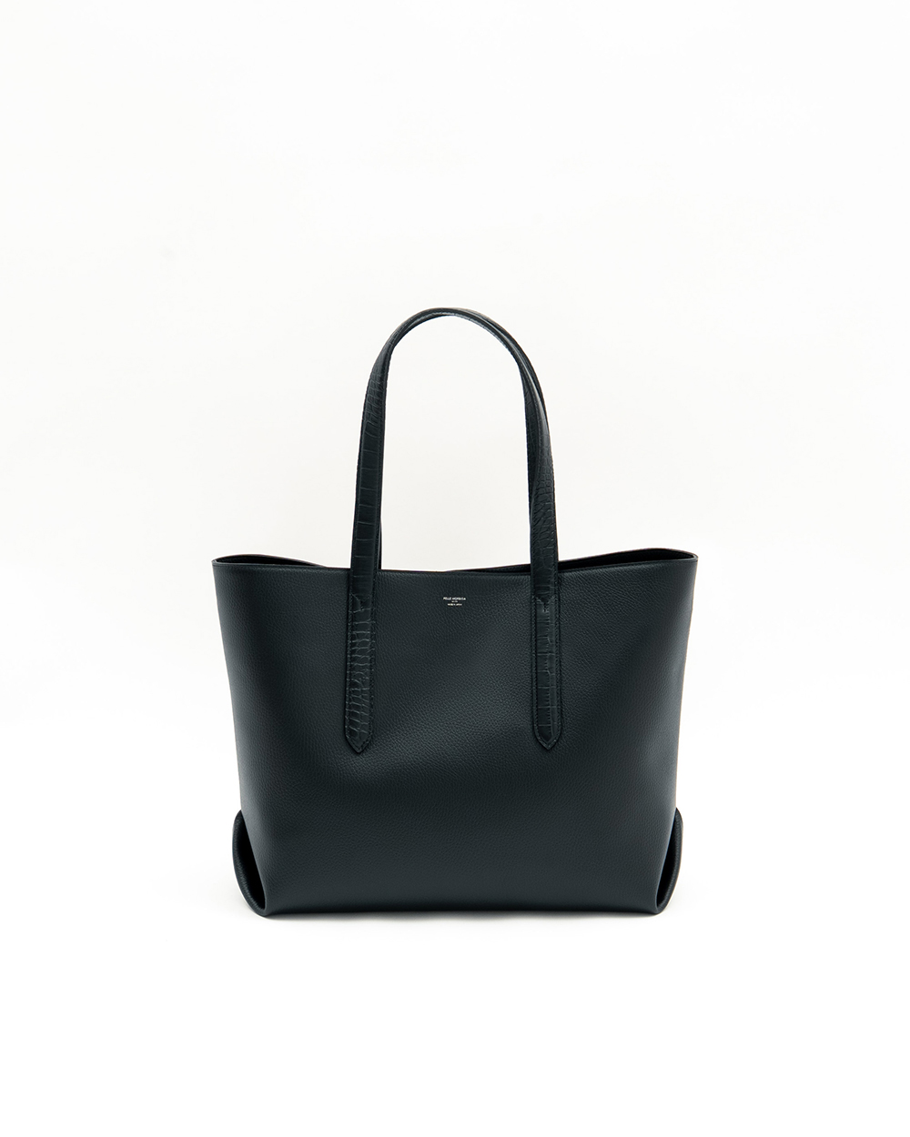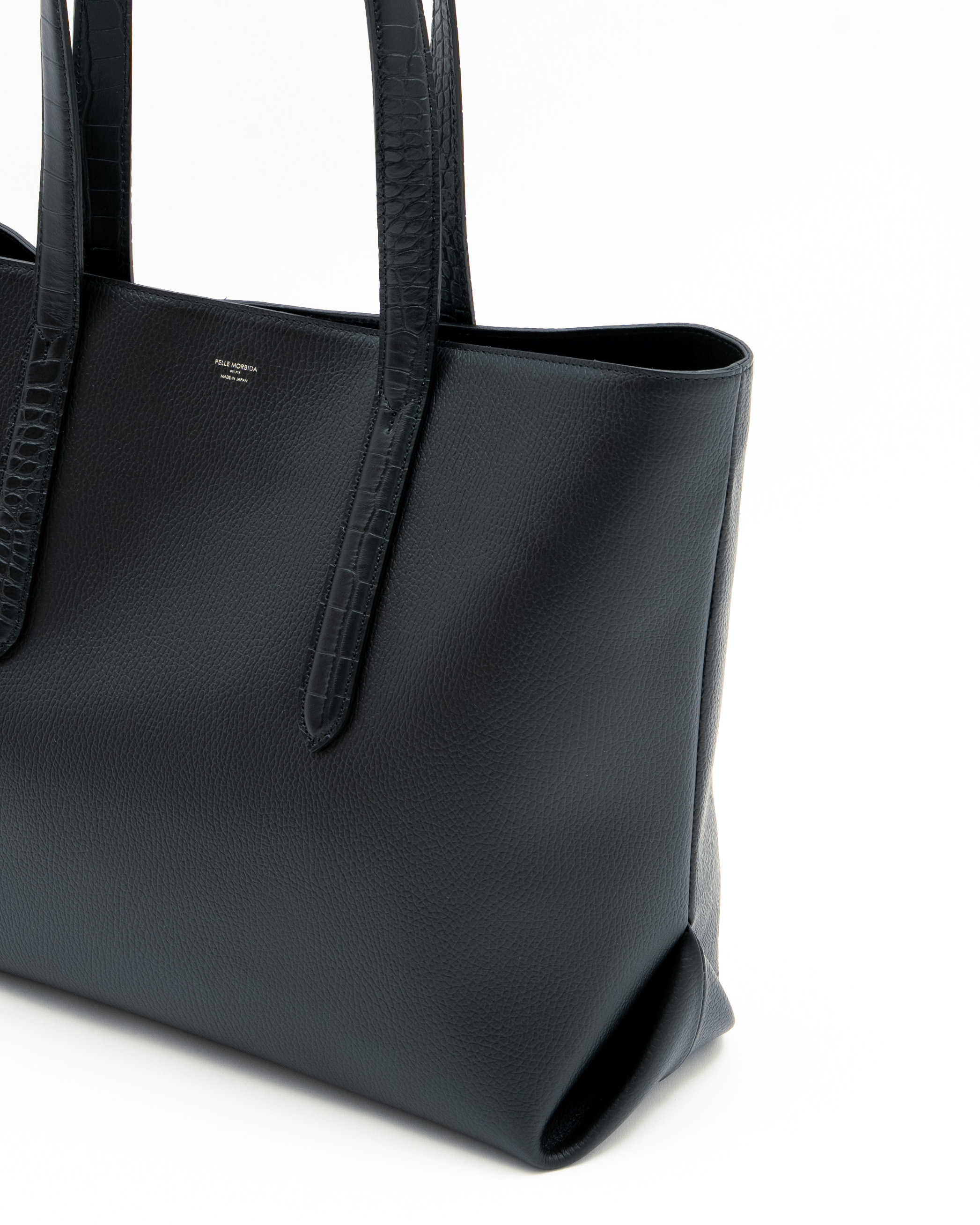 オールブラックでトーンを合わせながら、ハンドルをクロコダイル調型押しレザーにしたモデル。さりげなくハンドルをのレザーを変えることでより上質な雰囲気に仕上がりました。